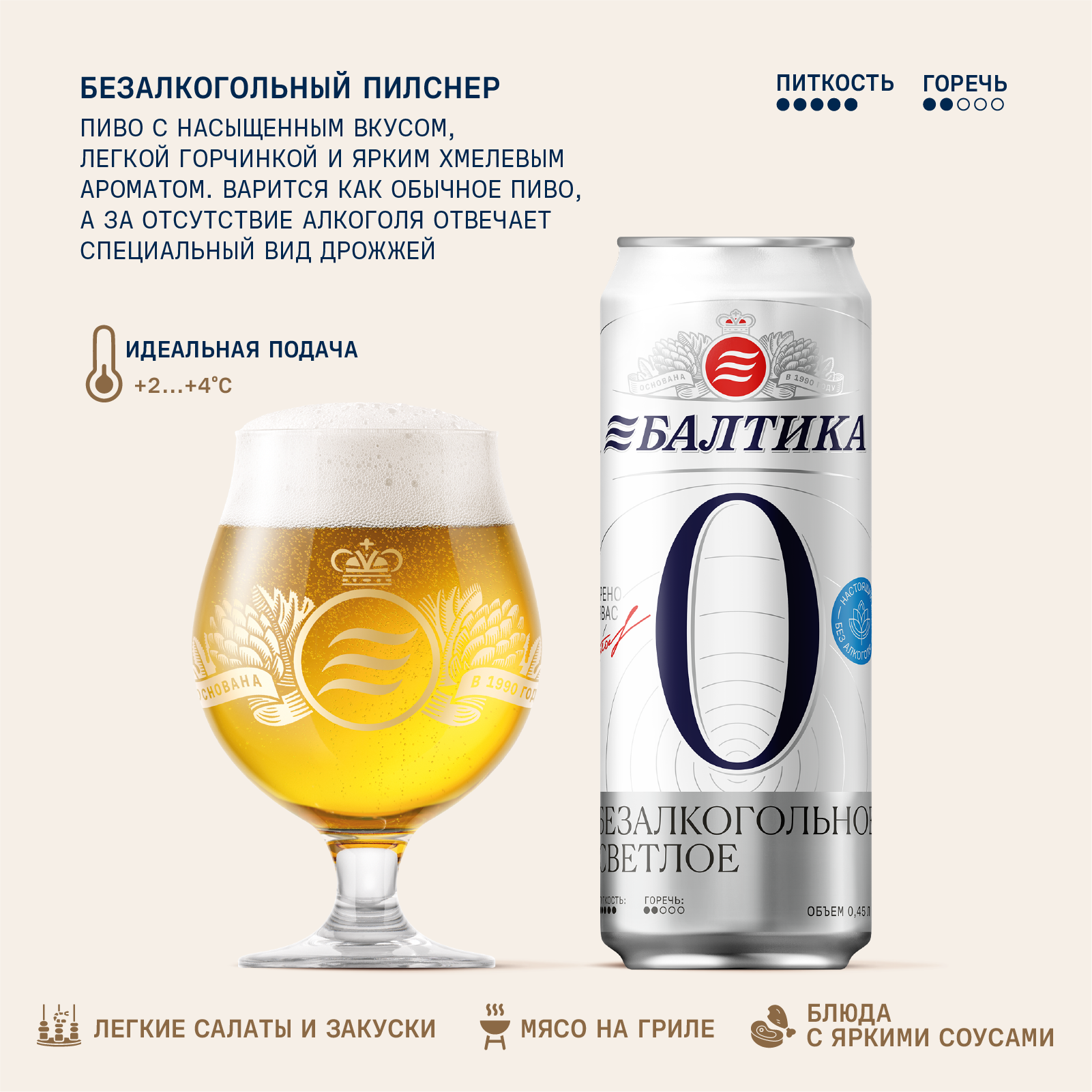 «Балтика №0» - это классический светлый лагер с насыщенным и освежающим солодово-хмелевым вкусом, только без алкоголя. Для варки Балтики 0 используются особые дрожжи, которые позволяют повторить технологию варки обычного пива. «Балтика №0» содержит минералы и витамины В, А и Е, которые помогают восстановиться после физической и умственной активности. 100% солод. Содержит всего 30 ккал на 100 г.