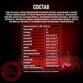 вода питьевая очищенная, солод пивоваренный ячменный светлый, ячмень пивоваренный, сахар, регулятор кислотности лимонная кислота, солодовые экстракты, ароматизатор пищевой натуральный, хмелепродукты, витаминный премикс (витамин Е, витамин В1, витамин В2, витамин В6, ниацин, фолиевая кислота, пантотеновая кислота, биотин, витамин В12, витамин С), сок яблочный концентрированный.