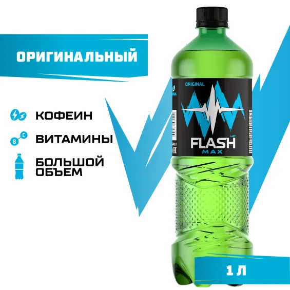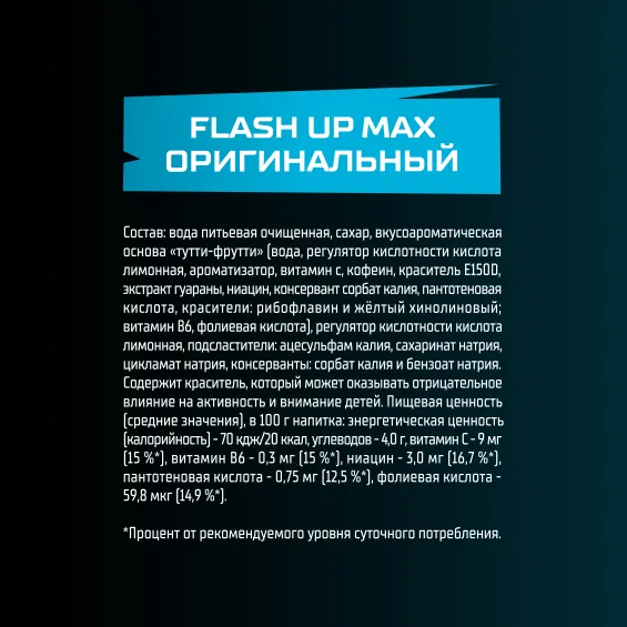 безалкогольный напиток, он содержит кофеин и гуарану, а также комплекс витаминов (B6, B3, B5, B9 и С), подобранных таким образом, чтобы снять усталость и стимулировать физическую активность. Это напиток для активных людей, которые любят жизнь и не хотят терять ни минуты из-за усталости. Flash UP Max идеально подходит для того, чтобы взбодриться в течение напряженного дня и получить заряд энергии, необходимый как для работы, так и для развлечений.