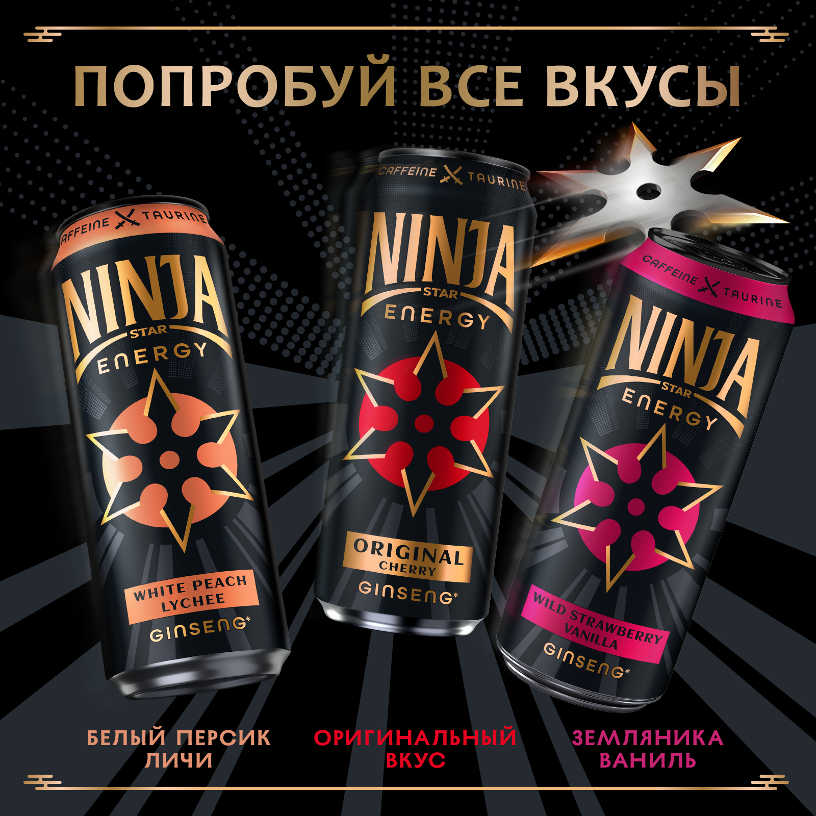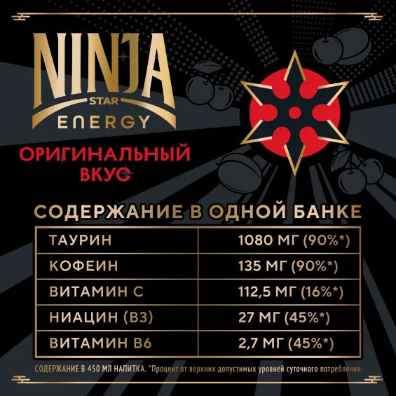 вода питьевая очищенная, сахар, регуляторы кислотности: кислота лимонная и цитрат натрия, добавка пищевая комплексная «Основа сокосодержащая Вишня-слива» (регулятор кислотности: Е330, Е300, таурин, вещества вкусоароматические, в том числе натуральные, кофеин, стабилизатор Е414, витамины: Никотинамид, D-пантотенат кальция, пиридоксина гидрохлорид, фолиевая кислота, соки концентрированные: вишни, сливы, консервант сорбат калия), таурин, сок черной моркови концентрированный, консерванты: сорбат калия и бензоат натрия, экстракт женьшеня
