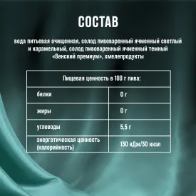 вода питьевая очищенная, солод пивоваренный ячменный светлый и карамельный, хмелепродукты.
